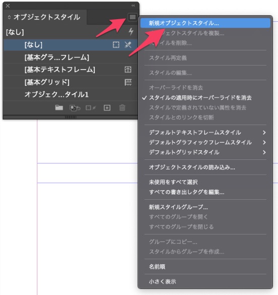 3.パネルメニュー(右上の小さな三本線アイコン)から [新規オブジェクトスタイル] を選択します。