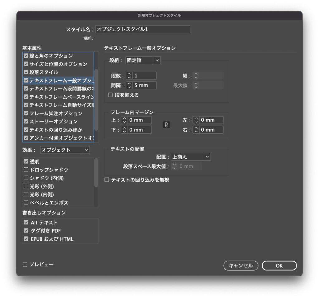 4.表示されるダイアログで、[テキストフレームの一般オプション] セクションを選択します。