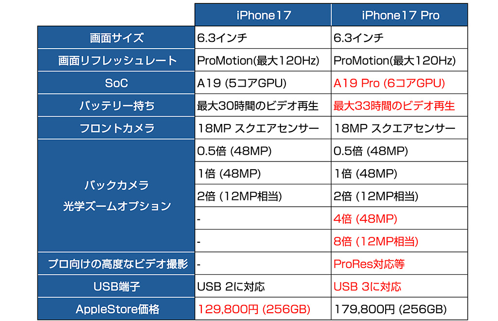 まずは、iPhone 17と17 Proの主なスペックの違いを見てみましょう。