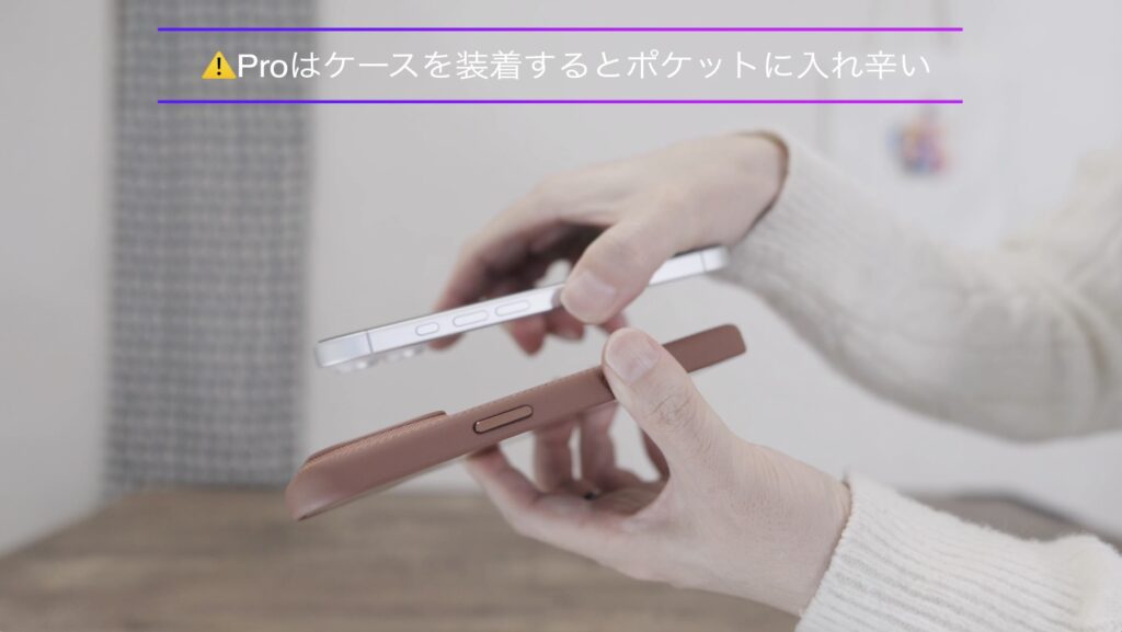 - iPhone 17 Pro: 厚みがあり、特にケースを装着するとカメラ部分の出っ張りが大きくなります。この出っ張りがズボンのポケットに入れる際に引っかかりやすく、ストレスを感じることがありました。