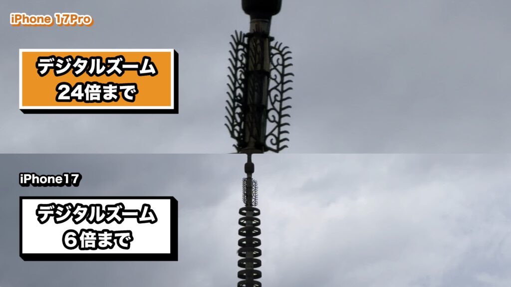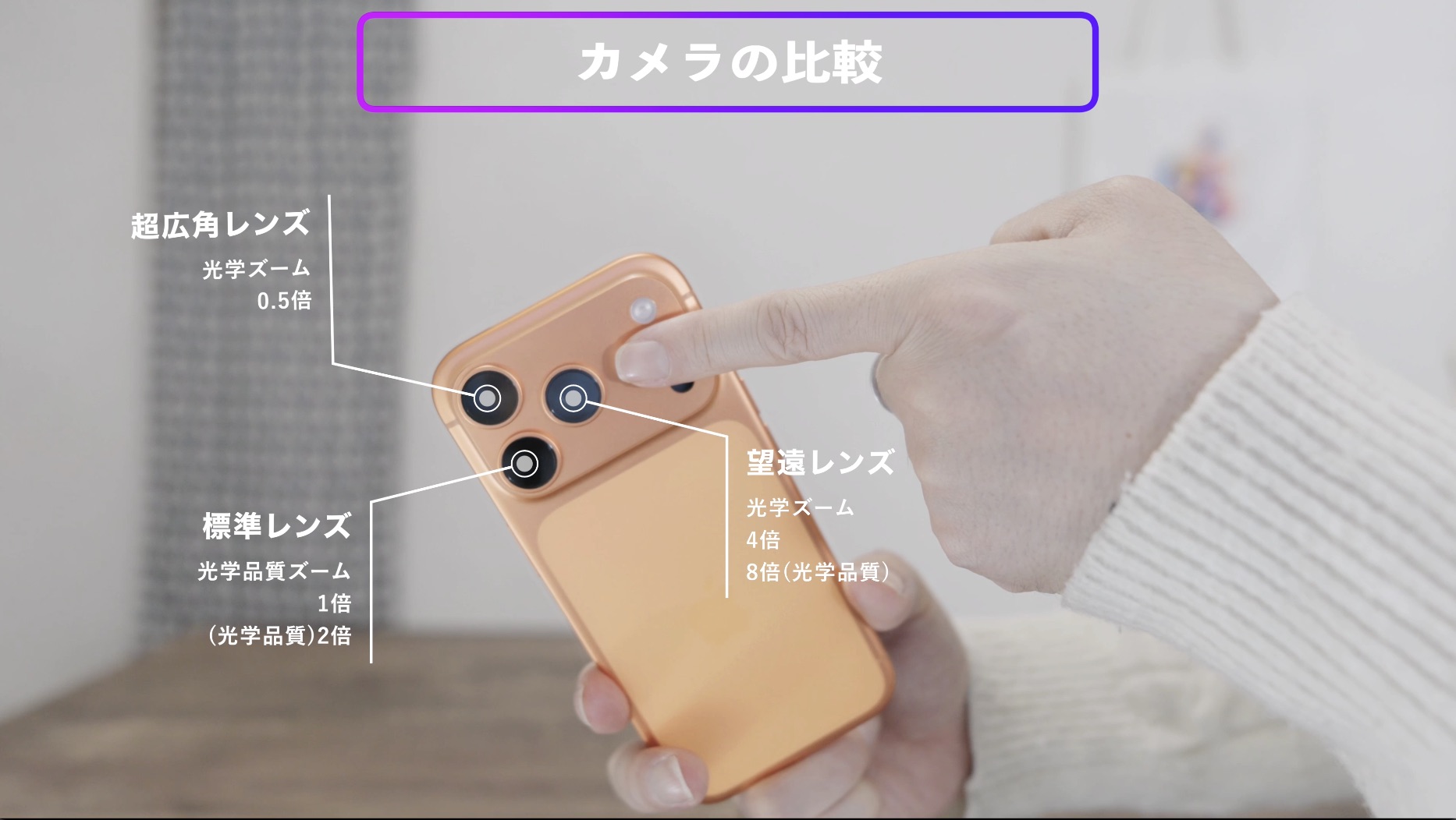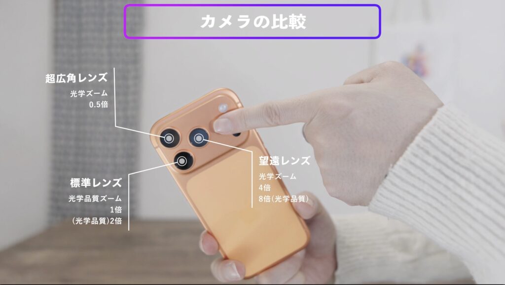 - iPhone 17 Pro: 超広角(0.5倍) / 標準(1倍・2倍) / 望遠(4倍・8倍) の3眼レンズ。