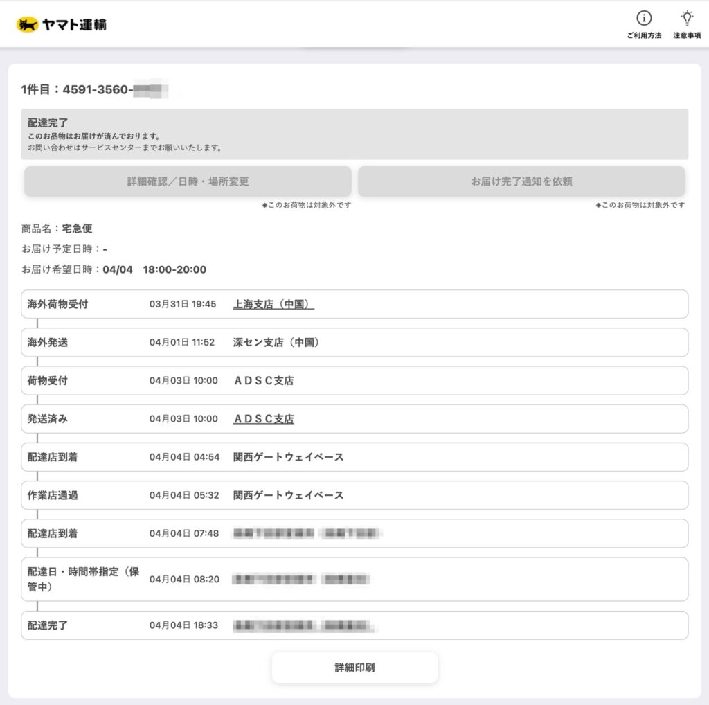 - 4月4日 19:45:配達店到着 関西ゲートウェイベース
