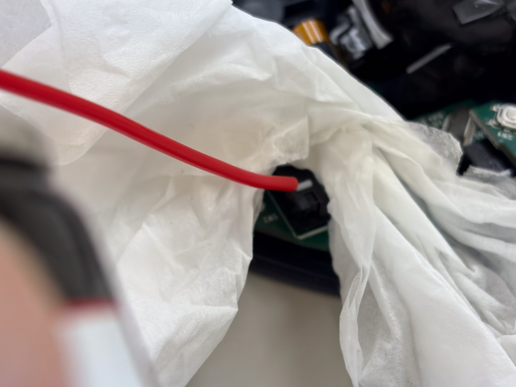 - 周囲をガードする スイッチ以外の基盤に液がかかると故障の原因になります。スイッチの周りをティッシュペーパー等で囲い、液が飛び散らないように養生します。