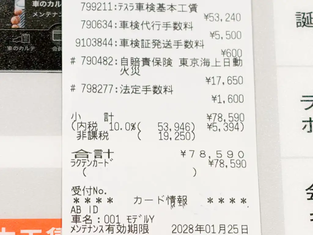 登録から5年間は重量税が0円なのはEVの大きなメリットですね。総額7万円台でテスラの車検が完了したのは、かなりコストパフォーマンスが良いのではないでしょうか。