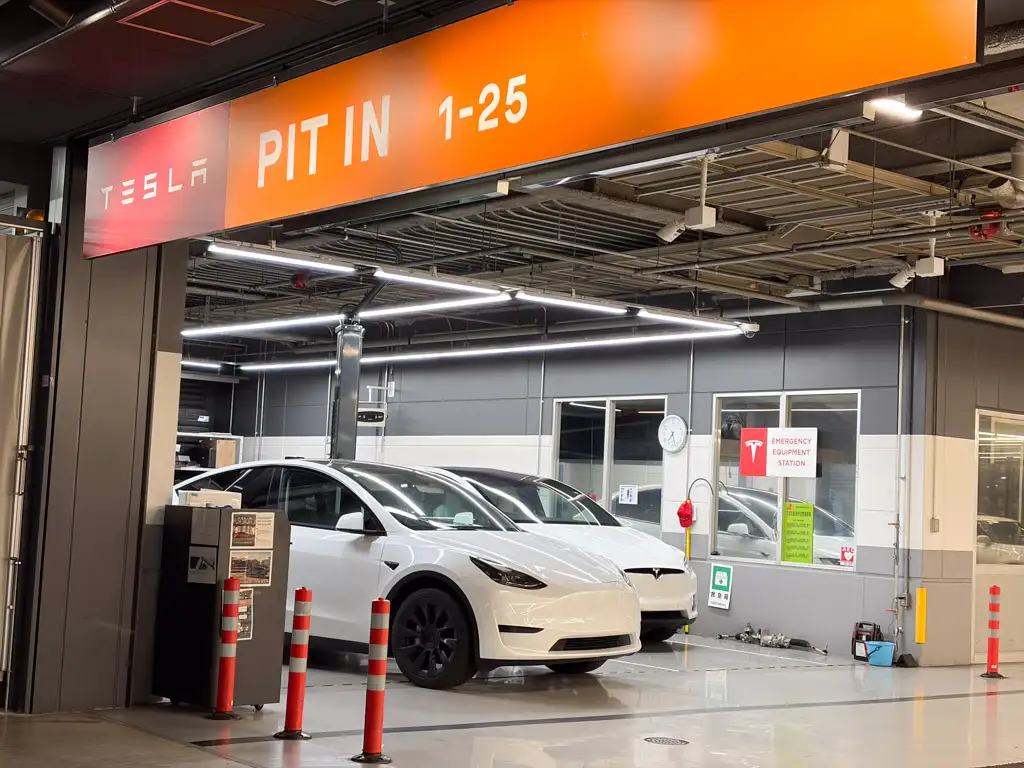 車を受け取る際に整備ピットを覗いてみましたが、壮観でした。 整備中のテスラ車が4台以上。さらに整備完了と思われる車両を含めると、ざっと10台近くのテスラが停まっています。 メーカー別の台数で見ると、トヨタ車に次いで2番目に多いのでは?というレベル。